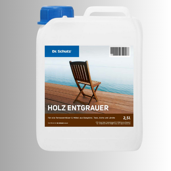 Pre-clean the surface. Protect adjacent surfaces not to be treated. Pre-wet the wood surface with clean water. Apply Dr. Schutz Entgrauer liberally to the surface using a metal-free plastic brush or a paintbrush and allow to work in for at least 10 minutes. Use a brush to vigorously work the remaining product along the wood grain. Rinse thoroughly with water (e.g., with a garden hose). Repeat the treatment for very stubborn dirt. Once dry, recondition the wood surfaces, e.g., with Dr. Schutz Terrassen Öl or Dr. Schutz Bangkirai Öl.